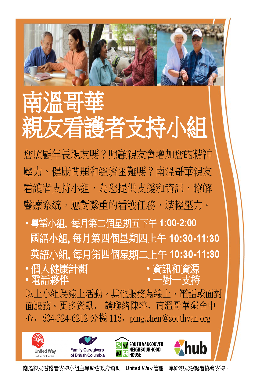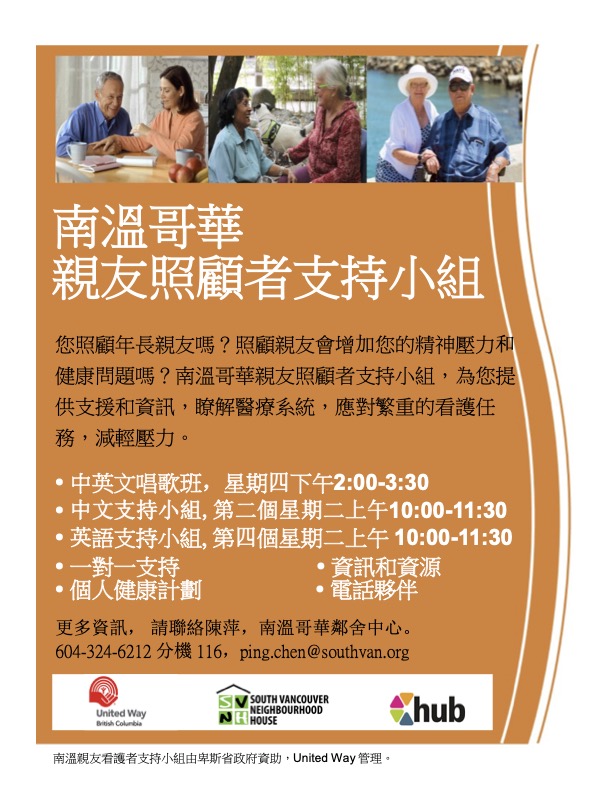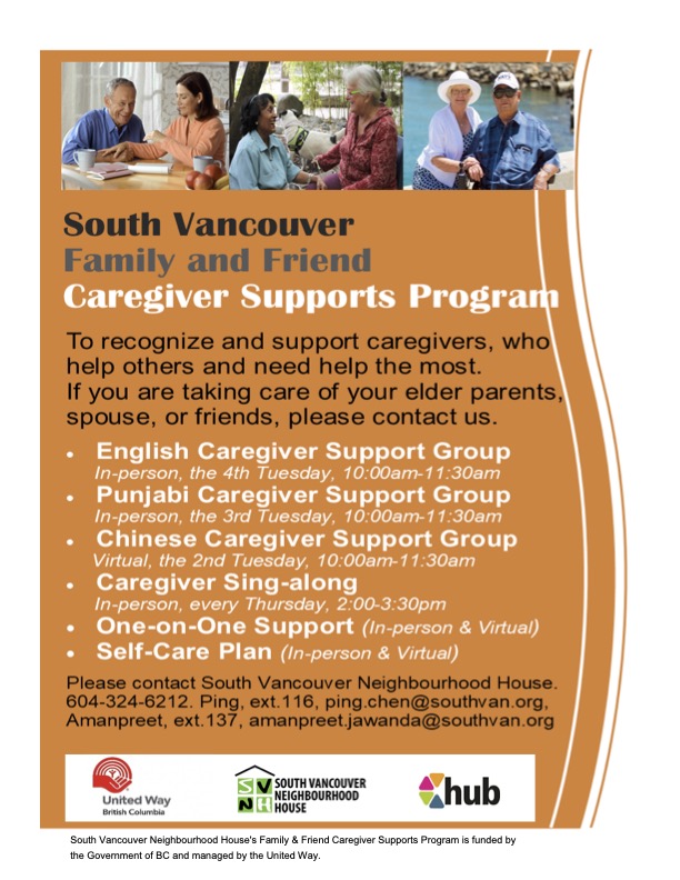 South Vancouver Neighbourhood House’s Family & Friend Caregiver Supports Program is funded by the Government of BC and managed by the United Way BC.