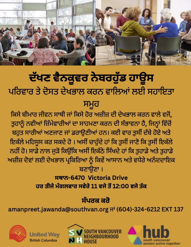 - Punjabi Support Group, in person, every 3rd Tuesday morning