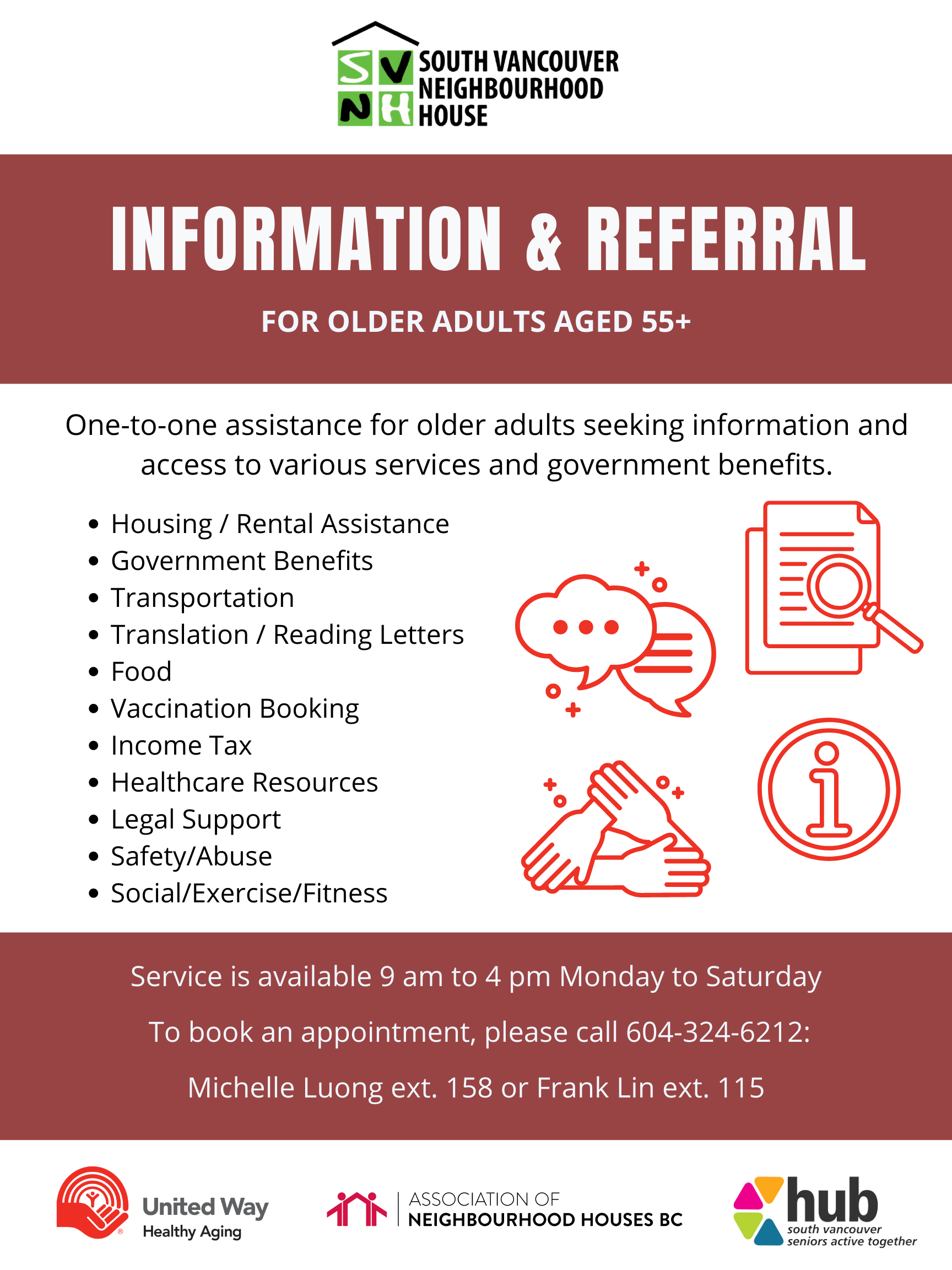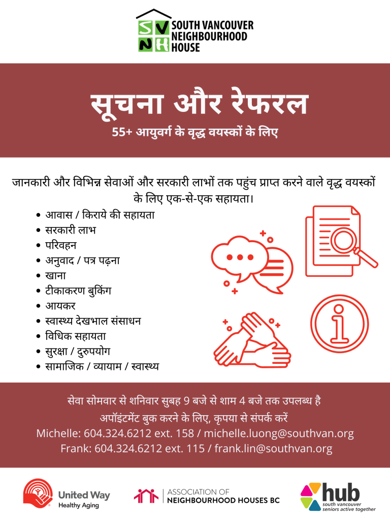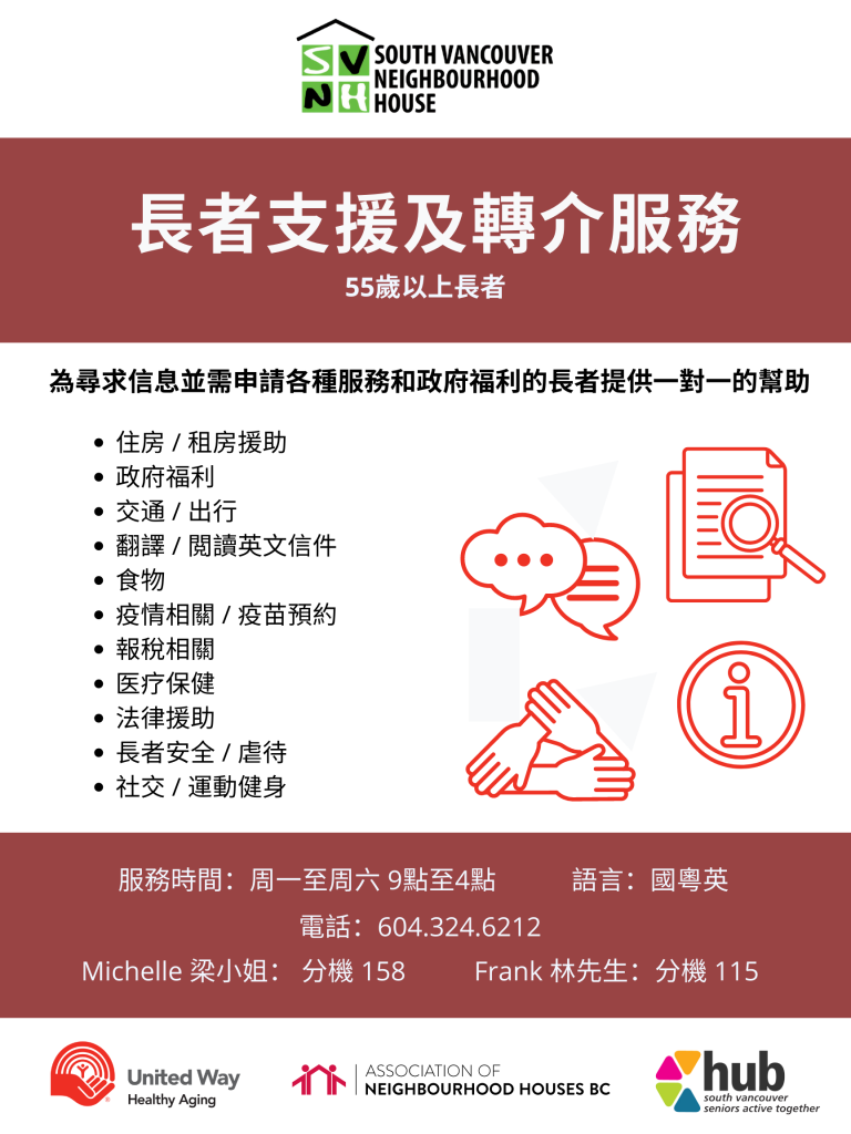 Our new Information & Referral program offers free, confidential information and referral services to seniors ages 55 and older. We assist seniors to navigate through government systems, and fill out application forms, access information, services and resources for: